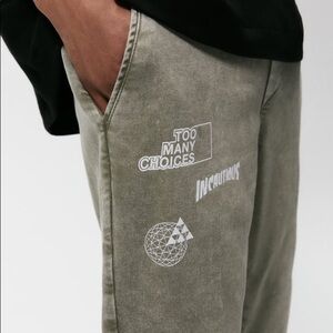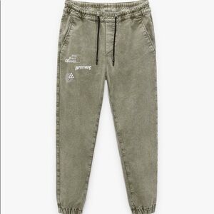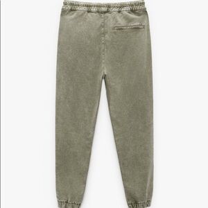 Baggy jogger trousers with an elastic drawstring waistband. Front pockets, rear welt pockets, acid wash effect and cuffed elastic hems.