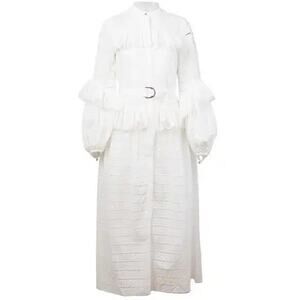 Acler ivory Valentine midi dress. Sitting relaxed on the body, this elegant shirt dress is crafted from cotton with intricate broderie throughout. Featuring full length blouson sleeves and button front closure, this midi dress is elevated with frill trimmings throughout. Finished with a gold D-ring belt to highlight the waist