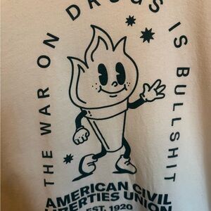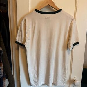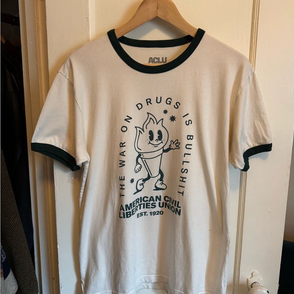 ACLU graphic ringer tee featuring a bold design. Cream with dark green trim.