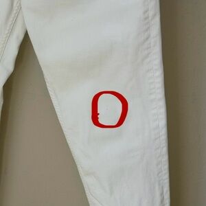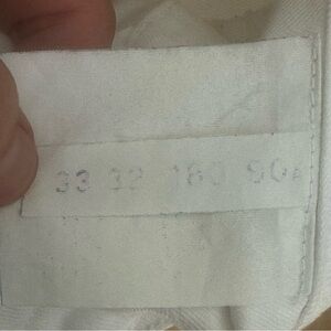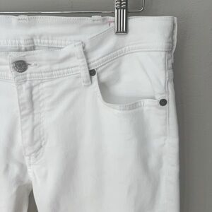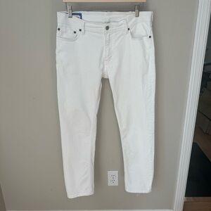 Size 33. Made in Italy. Perfect summer jean! Very very good condition. Bright white. The inside size/fabric labels are very faded. I believe the fabric to be 98% Cotton, 2% Elastane. Has stretch. Slim leg. Mid-rise. Ankle length. 5 pocket styling. Zip-fly. Antiqued brass-tone and silver-tone hardware. White stitching. There is one teeny tiny pin sized gray mark on lower front leg. See last 2 photos. The brown label on waistband is starting to tear a little on the edges - see photo. Washed in high-end The Laundress Denim Wash, hung dry and ironed. All ready to wear! Approximate measurements (taken when laying flat - cannot guarantee fit):