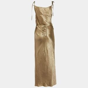 This Acne Studios dress is crafted from lightweight, non-stretch hammered satin. It features slim tie shoulder straps, a wrap silhouette with tie at the waist, contrast stitch trim, and a draped design. It has a scoop neck and a maxi length