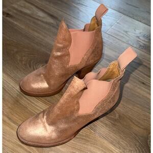 Elevate your shoe game with these stunning rose gold metallic leather ankle boots from Acne Studios. The almond toe and Western-style design add a touch of classic charm to this modern boots. The Western heel provides comfort and stability for all-day wear, while the pull-on closure and elastic side gusset ensures easy on-and-off wearability. Crafted with high-quality leather, these boots are built to last, making them a perfect addition to your collection. The leather lining and insole provide comfort and breathability, making them comfortable to wear for any occasion. These boots are in excellent condition and will leave a lasting impression wherever you go.