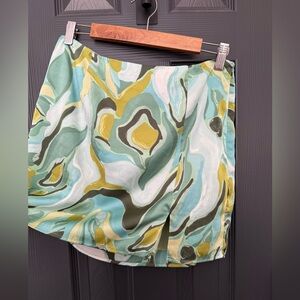 Elevate your style with this chic abstract patterned mini skirt. Featuring a blend of green, yellow, and white hues, it's perfect for any occasion.