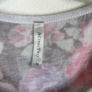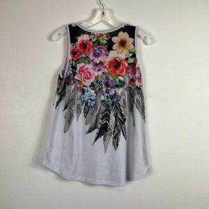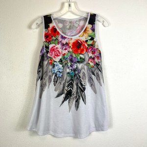 ACTING PRO TANK TOP SIZE MEDIUM WHITE AND BLACK WITH FLORAL AND FEATHER DESIGN