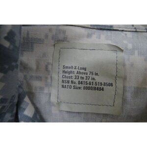 Set of ACU trousers, small long, Coat small X-Long in the Digital Camo/Nylon print. Height is above 75" chest 33-37" Good pre-owned condition with no holes, tears, rips or stains noted.