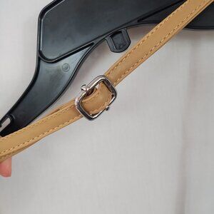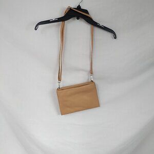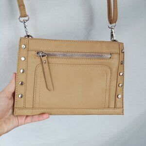 Stylish tan crossbody bag perfect for everyday use. Features a sleek design with two main zippered pockets. There is a smaller pocket in one of the main pockets and a smaller inner zipper pockets in the other main pocket. There is also an external, front zipper pocket. Adjustable strap allows it to fit a person of any height. The strap is removable, turning it into a clutch.