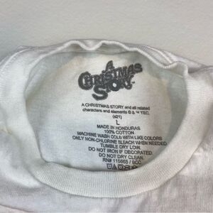 A Christmas Story t shirt in size large. The shirt is pre-owned and there are no stains or rips. Minor wash wear and pilling. The graphic is purposely made to look distressed.