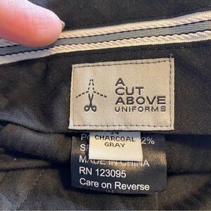 A Cut Above Uniforms Dark Gray Dress Pants Size 34. Excellent like new condition. 45% wool, 52% polyester and 3% spandex. 2 front pockets and 2 button back pockets. Bottom cuff has been hemmed. Measures waist 34”, inseam 29”, rise 11”.