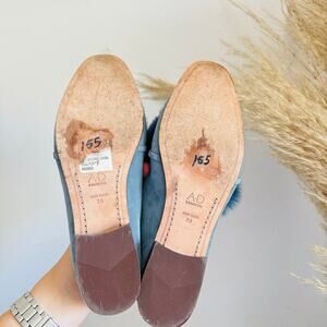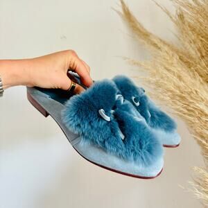 AD DAUGHTERS Blue Grey Rabbit Fur Flats Pointy Toe Bow Slides Mules Shoes 7.5