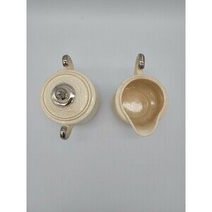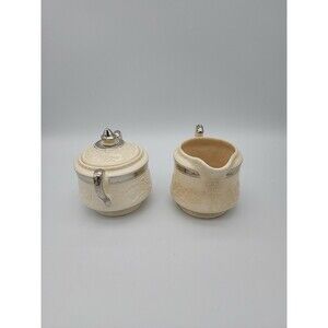ADAM ANTIQUE by STEUBENVILLE Sugar Bowl w Lid & Creamer Cream with Silver Trim. The sugar is in exceptional condition. Silver trim doesn't show any wear. There are no chips, cracks or repairs. The creamer has issues. It has a repair at the handle, and it is very crazed and discolored. Some wear on silver trim. I don't see any chips. See the photos. Measurements are inside the photos. Item is sold as is. Please ask all questions before purchase.