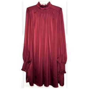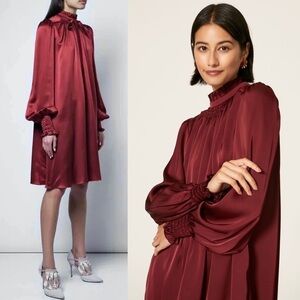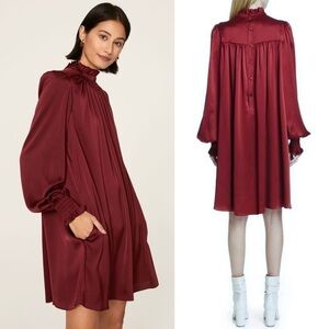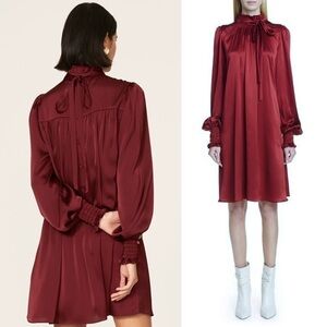 ADAM LIPPES 70s Satin Ruffle Bow Tie Mockneck Puff Long Sleeve Smock Cuff Dress