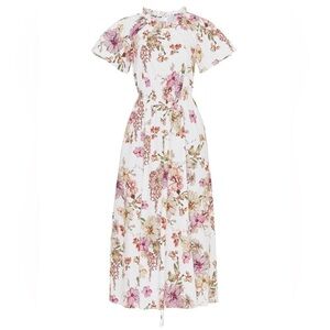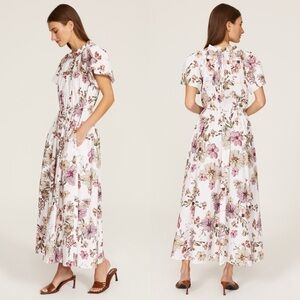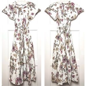 ADAM LIPPES Floral Short Sleeve Ruffle Trim Cinch Tie Waist Shirred Maxi Dress 4