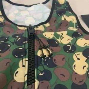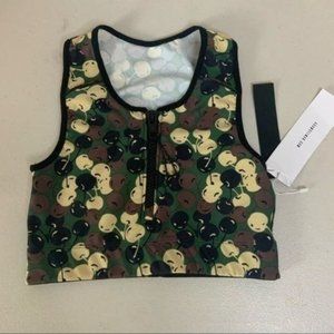 Absolutely adorable and fun round neck zip front sleeveless tank top style crop top with amazing novelty cherry print camo style from the brand Adam Selman sport