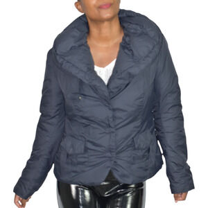 Black puffer jacket from the Italian brand ADD (Add Down). This short, padded coat features a distinctive, voluminous funnel neck oversized collar. The jacket is filled with premium goose down making it incredibly warm yet lightweight. It features a hidden snap front closures. Two front pockets and hidden side seam zippered pockets.