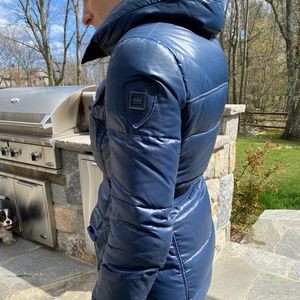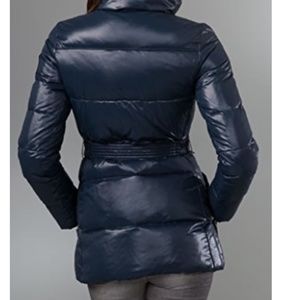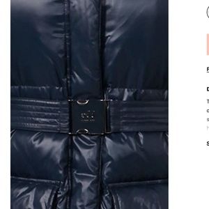 This down-filled puffer jacket features a 2-snap closure at the funnel collar and a buckle closure at the gathered elastic belt. Detachable hood. Hidden 6-snap and zip closures. Faux pockets at bust and snap-flap pockets at hip. Long sleeves. Lined.