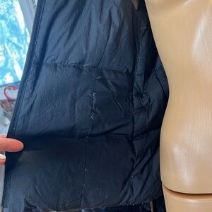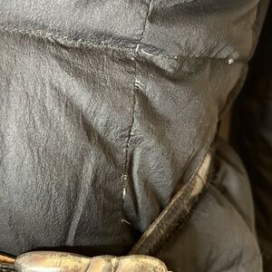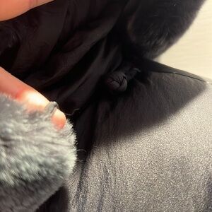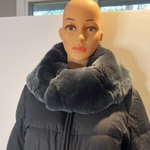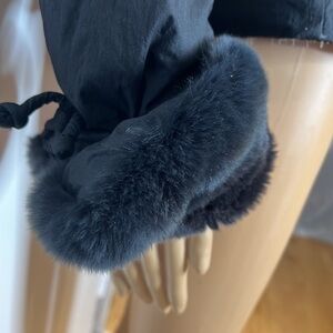This is a beautiful ADD Sz 4 Addlight Down Ltd Edition down and Zip w/ Belt Jacket. Charcoal Black, so a super dark gray. The original belt is lost, but I added a cool leather and metal vintage belt. Two slip in pockets. Super lightweight and warm. Full zipper front. Super soft sheared real fur. Fur collar can be wrapped around with loop closure. Fur cuffs can be worn flipped or down. Very slight down peek thru the seams but not an issue. Made in Italy. Sleeves 23-25” inches