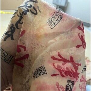 The fabric is a lightweight, semi-sheer silk linen blend. (As you can see in photo #12, you can see my hand through the fabric with my bright desk light behind it.) The Asian inspired calligraphy design in red and black is gorgeous against the tan background. The mother-of-pearl buttons add a pretty glimmer to the front.