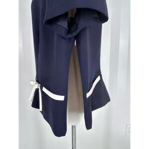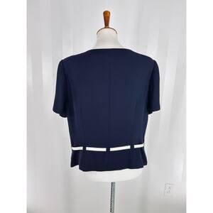Fabulous navy blue blouse features a square neckline and short sleeves. It has an ivory satin bow embellishment around waist and a side zipper closure. This blouse is fully lined. Don’t miss out on this Address Maggy blouse.