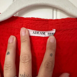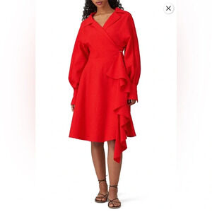Such a flattering dress! Color looks very red in pictures but I’d say it’s a mix of red/orange.