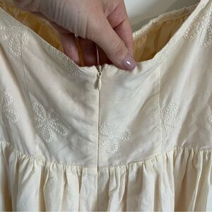 ADEIRLINA Vendela Cottagecore Puff Sleeve Praire Midi Dress. Embrace the finest feminine energy in this delicately crafted sundress. We love the intricate bust design and the fitted faux-corset look. It rounds the torso in a flattering way. Also, the dainty embroidered and cutout detailing against the off-white fabric comes together to spin the perfect summer enchanting look. Skater midi dress in creamy eggshell color. Ruched details at bust-line for a delicious fit. Tailored in fitted corset style minus the boning. Super cute and short puff sleeves. Fully elasticated neckline and sleeves. Tie-knot drawstring in the center. Made from super soft and breezy fabric. Lightly gathered skirt at the waist. Intricately decorative hemline. Fully lined for comfort. Comes with in built-hidden zipper in the back.
