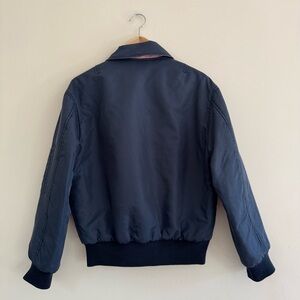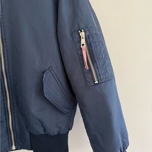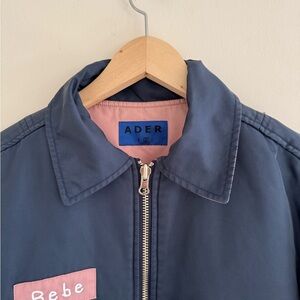 Super rare reversible bomber jacket from Korean brand ADER error, in collaboration with BEAKER. One side is navy with a pink “Bebe” patch and sleeve zip pocket. The other side is dusty pink with “02” embroidery on chest pockets.