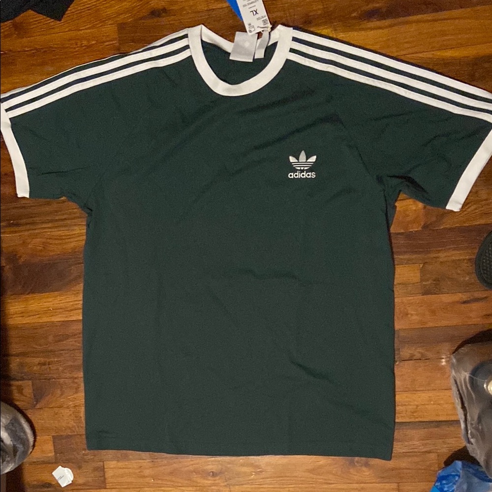 Embrace a retro vibe with this Adidas tee, showcasing a deep forest green body accented by iconic white stripes on the sleeves. The classic crew neck design and small embroidered trefoil logo add a timeless touch to this athletic-casual staple.