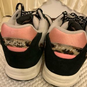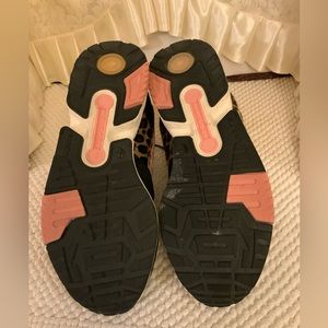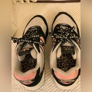 WHITE BLACK PINK ALSO ANIMAL HAIR LEOPARD PRINT ON SIDES AND ACROSS BACK HEELS TOP. 3 PINK STRIPES