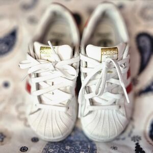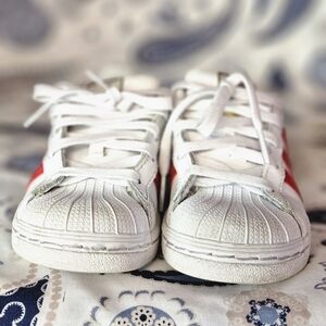 Used no box UNISEX size 11 toddlers white/red ADIDAS shell toe shoes. Shoes are in great condition. Still has a lot of life in them. Please see pictures. Conditon 8/10