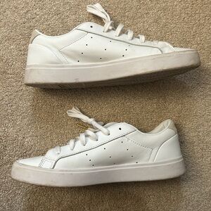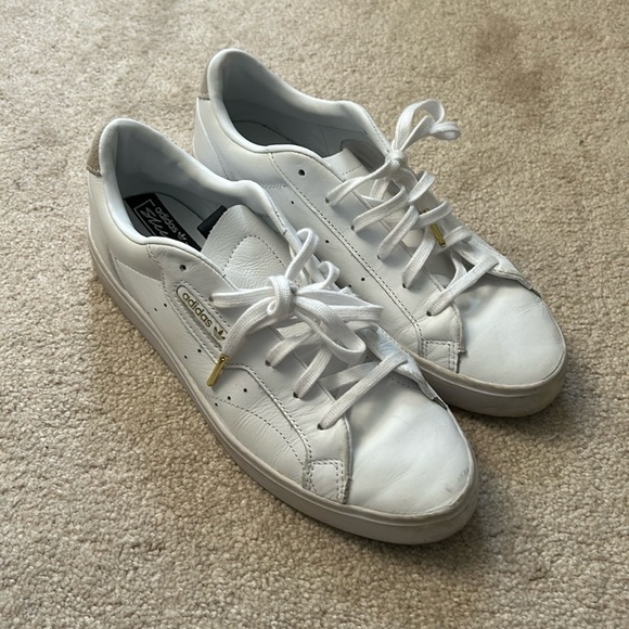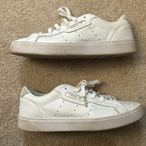 love these sneakers. i’m a size 10 and my last pair of adidas ran big so i ordered 1/2 a size down, they are slightly tighter than i’d like. sad to part with. they are brighter and more white than the photos lead on.