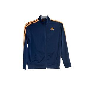 ADIDAS, Athletic Lightweight Youth, Blue & Orange , Unisex, Large, Junior 14-16 zip up Jacket, Should fit a Woman’s Small. Zipper pull has Adidas logo, 3 orange stripes down the sleeves, 2 pockets. If these are your school colors, would be a great jacket. 100% Polyester Please see approximate measurements in pictures before purchasing. Use your own judgment as to the fit. Send me an offer. I will either accept or counter!