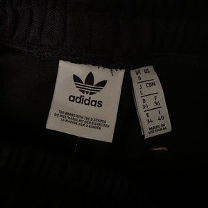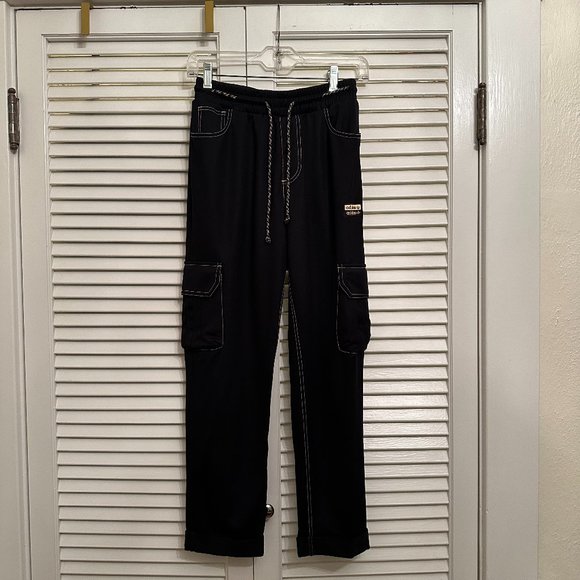 Worn once! This is a pair of ADIDAS track pants. Black with gold topstitching. Cargo pockets with Adidas three stripes. Drawstring waist. Sz small.