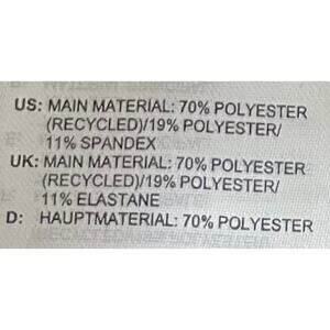 70% Polyester, 19% Recycled Polyester, 11% Elastane; Recommended on Tag: Machine wash cold, tumble dry low