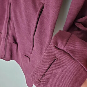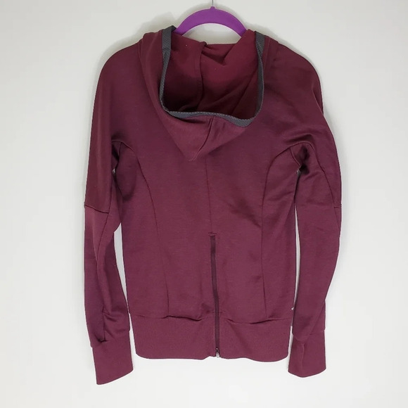 Adidas sport jacket hoodie sz small, worn a couple times and is in excellent condition, No holes, rips, stains or tears. Burgundy in color, zipper front closure, 2 front functional pockets, reflective mesh trim around the hoodie and has thumb holes