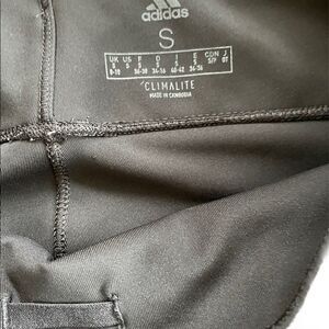 Adidas Climalite 3 stripe black Capri length leggings, size S. Wide waistband, polyester and elastic blend. Approximate measurements are waist flat 13”, rise approximately 8.5”, inseam approximately 20”.