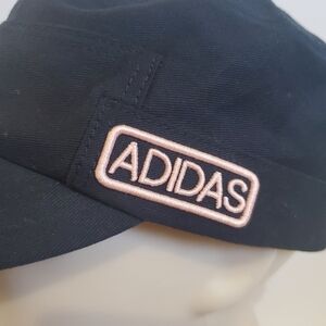Adidas Climate Women's Black Pink Hat Cap. Newsboy style, all over black in color, light pink embroidered logo on side of cap, smaller brim, logo tag on back, adjustable metal clip for a custom fit, cushioned inner headband. Outer layer is 100% cotton fabric, while the synthetic cool-to-the-touch fabric is layered underneath. No fading or tears. Like new condition!