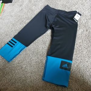 Black and blue capri leggings. Slight damage as seen on the waist area. Not noticeable unless you stare closely.
