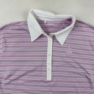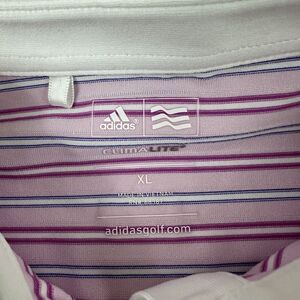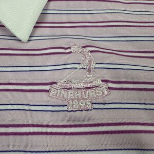 This stylish polo shirt from adidas Golf is perfect for any occasion, whether it's a casual day out or a work event. The shirt is designed with a collared neckline and cap sleeves, featuring a striped pattern in pink, purple, and white. The embroidered logo adds a touch of elegance to the shirt, making it suitable for travel, party/cocktail, and other occasions. Made from a blend of polyester and spandex, the shirt offers stretch and comfort, making it suitable for winter, summer, fall, and spring. It is machine washable for easy care and comes in size XL. Whether you're a golf enthusiast or simply love the PUTTERBOY and Pinehurst Resort & Golf Club theme, this shirt is perfect for you.