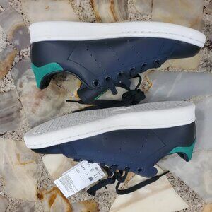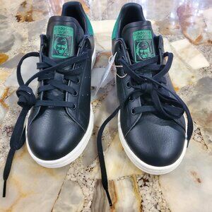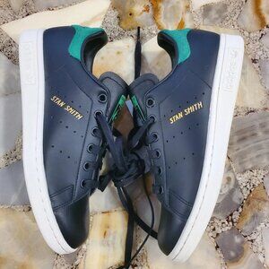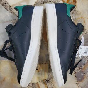 These Authentic ADIDAS GZ6314 Stan Smith OG sneakers in Men's Size 5 (UK 4.5/FR 37.5/JP/230/CHN 230) feature a classic low top shoe shaft style with a lace-up closure for a comfortable and secure fit. Made with leather and suede upper material and a rubber outsole, these black and green sneakers from the Adidas Stan Smith product line are perfect for walking or everyday activities. The iconic adidas branding and sneaker style make these shoes a stylish and functional choice for quality athletic footwear.