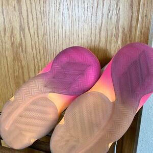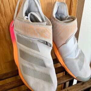 Pre-owned basketball shoe, has small spot inside by ankle. They are EF3593 white, gray, orange & pink. Hook and loop closure. Women's Size 6 US.