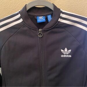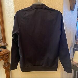 Pre-owned in great condition with no rips or stains. Kids Teens black with white stripes zipped track jacket. Can be unisex. Comes from smoke and pet free home.