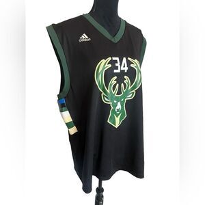 Show your support for the Milwaukee Bucks with this Adidas Giannis Antetokounmpo Jersey in vibrant green. Designed for performance, this XL men's jersey is perfect for game days, casual outings, or even a spirited pick-up game. The breathable fabric ensures comfort, while the bold team colors and official NBA licensing make it a standout piece. Whether you're cheering from the stands or hitting the court, this jersey has you covered. Pre-owned but in excellent condition, ready to bring the Bucks' spirit to your wardrobe.