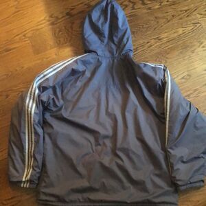 ADIDAS Dark Grey Hooded Coat with Triple Stripe Light Grey Stripes Down Each Arm