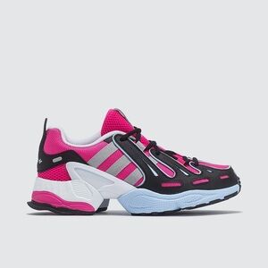 Dynamic Adidas shoes with bold pink and black design. Ideal for active lifestyles.