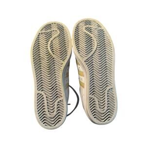 These are a pair of previously owned Adidas superstar, iridescent, white sneakers. Lots of life left in them youth size 5, women’s size 6.5.