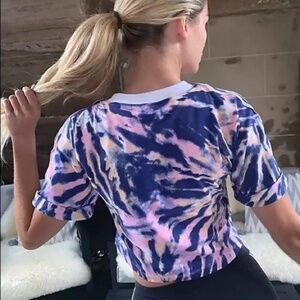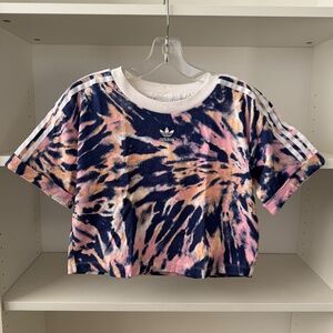 All-over tie-dye print. Crew neck. 3-Stripes to sleeve. Trefoil logo embroidery to chest. Size small