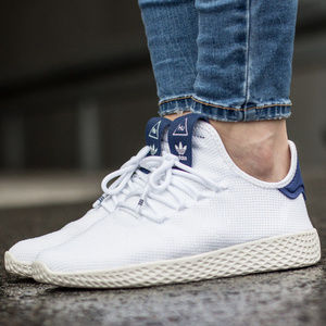 New in box! In White/Blue adidas Originals joins forces with genre-defying star Pharrell Williams in these signature shoes. They feature a knit upper with a snug, sock-like fit. A grid-pattern EVA midsole with rubber inserts provides traction and support.