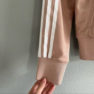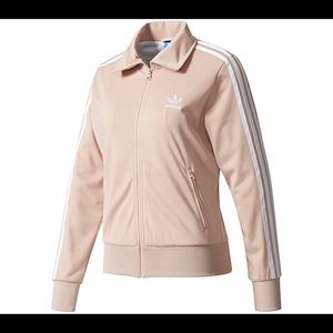 This women's track jacket puts a chic spin on the iconic Firebird. Classic 3-Stripes and a sporty stand-up collar keep the jacket rooted in original design, while vintage graphics and a dust pearl colorway add fresh style. The images are drawn from '50s adidas catalogs and revamped for a look that's both playful and polished. Front zip pockets Full zip with stand-up collar; Ribbed cuffs and hem Applied adidas archival graphic on back Randomly placed adidas.