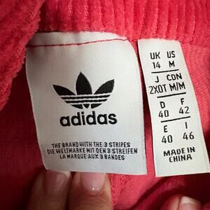 Adidas Originals women’s corduroy overalls in bright pink, size Medium (US 14). Features bib front with chest pocket, embroidered Trefoil logo, adjustable straps with metal hardware, and straight-leg fit. 100% cotton corduroy.