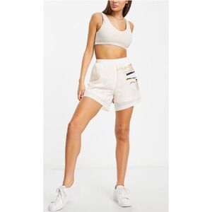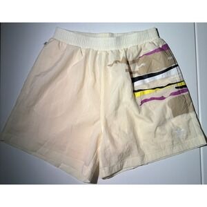 The ADIDAS Originals x Thebe Magugu Women's Athletic Shorts in size Small are a stylish and functional addition to any activewear collection. Featuring a colorblock pattern in beige, these shorts are made from lightweight and breathable polyester material, perfect for various athletic activities such as running, training, and cycling. The pull-on closure with an elastic waist ensures a comfortable and secure fit, while the pockets and lining add practicality to the design. Machine washable and easy to care for, these shorts are a versatile and modern choice for active women.