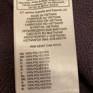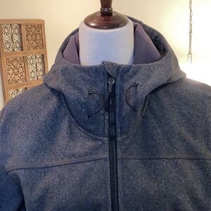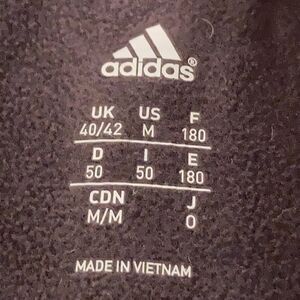 Medium weight full zip jacket with scuba hood by Adidas features zip close hip pockets, elastic cords to adjust at hem and hood, and interior breast pockets on both sides; soft flannel-like feel on exterior, and fleece-feel on interior. This one will keep you warm! Approx 23" armpit to armpit, 28" mid-shoulder to hem, 26" sleeves.